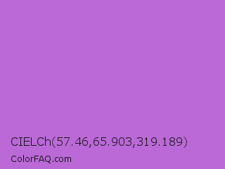 CIELCh 57.46,65.903,319.189 Color is a light purple color and the nearest color is Rich Lilac #b666d2. Hex code #ba69d6 and RGB value is rgb(186,105,214). In RGB color space, this color is composed of 73% red, 41% green, 84% blue, In CMYK color space, this color is composed of 13% cyan, 51% magenta, 0% yellow , 16% black , In HSL color space, this color has a hue angle of 285° , 57% saturation and 63% lightness.