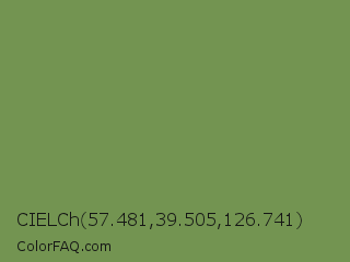 CIELCh 57.481,39.505,126.741 Color is a normal green color and the nearest color is Asparagus Green #7ba05b. Hex code #739451 and RGB value is rgb(115,148,81). In RGB color space, this color is composed of 45% red, 58% green, 32% blue, In CMYK color space, this color is composed of 22% cyan, 0% magenta, 45% yellow , 42% black , In HSL color space, this color has a hue angle of 90° , 29% saturation and 45% lightness.
