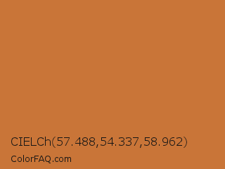 CIELCh 57.488,54.337,58.962 Color is a normal orange color and the nearest color is Bronze #cd7f32. Hex code #c97538 and RGB value is rgb(201,117,56). In RGB color space, this color is composed of 79% red, 46% green, 22% blue, In CMYK color space, this color is composed of 0% cyan, 42% magenta, 72% yellow , 21% black , In HSL color space, this color has a hue angle of 25° , 57% saturation and 50% lightness.