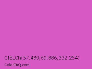 CIELCh 57.489,69.886,332.254 Color is a normal magenta color and the nearest color is Fuchsia Pink #c154c1. Hex code #d659c4 and RGB value is rgb(214,89,196). In RGB color space, this color is composed of 84% red, 35% green, 77% blue, In CMYK color space, this color is composed of 0% cyan, 58% magenta, 8% yellow , 16% black , In HSL color space, this color has a hue angle of 309° , 60% saturation and 59% lightness.
