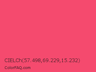CIELCh 57.498,69.229,15.232 Color is a light red color and the nearest color is Infra Red #ff496c. Hex code #f54a6e and RGB value is rgb(245,74,110). In RGB color space, this color is composed of 96% red, 29% green, 43% blue, In CMYK color space, this color is composed of 0% cyan, 70% magenta, 55% yellow , 4% black , In HSL color space, this color has a hue angle of 347° , 90% saturation and 63% lightness.