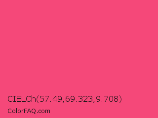 CIELCh 57.49,69.323,9.708 Color is a light rose color and the nearest color is Sasquatch Socks #ff4681. Hex code #f54879 and RGB value is rgb(245,72,121). In RGB color space, this color is composed of 96% red, 28% green, 47% blue, In CMYK color space, this color is composed of 0% cyan, 71% magenta, 51% yellow , 4% black , In HSL color space, this color has a hue angle of 343° , 90% saturation and 62% lightness.