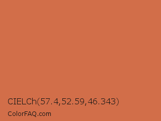 CIELCh 57.4,52.59,46.343 Color is a normal orange color and the nearest color is Copper Red #cb6d51. Hex code #d26e49 and RGB value is rgb(210,110,73). In RGB color space, this color is composed of 82% red, 43% green, 29% blue, In CMYK color space, this color is composed of 0% cyan, 48% magenta, 65% yellow , 18% black , In HSL color space, this color has a hue angle of 16° , 60% saturation and 55% lightness.