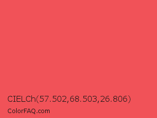 CIELCh 57.502,68.503,26.806 Color is a light red color and the nearest color is Carnation #f95a61. Hex code #f15258 and RGB value is rgb(241,82,88). In RGB color space, this color is composed of 95% red, 32% green, 35% blue, In CMYK color space, this color is composed of 0% cyan, 66% magenta, 63% yellow , 5% black , In HSL color space, this color has a hue angle of 358° , 85% saturation and 63% lightness.