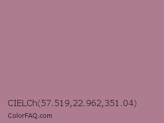 CIELCh 57.519,22.962,351.04 Color is a normal rose color and the nearest color is English Lavender #b48395. Hex code #ae7c91 and RGB value is rgb(174,124,145). In RGB color space, this color is composed of 68% red, 49% green, 57% blue, In CMYK color space, this color is composed of 0% cyan, 29% magenta, 17% yellow , 32% black , In HSL color space, this color has a hue angle of 335° , 24% saturation and 58% lightness.