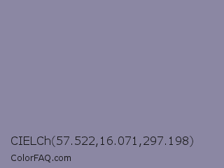 CIELCh 57.522,16.071,297.198 Color is a normal indigo color and the nearest color is Manatee Crayola #8d90a1. Hex code #8b87a3 and RGB value is rgb(139,135,163). In RGB color space, this color is composed of 55% red, 53% green, 64% blue, In CMYK color space, this color is composed of 15% cyan, 17% magenta, 0% yellow , 36% black , In HSL color space, this color has a hue angle of 249° , 13% saturation and 58% lightness.