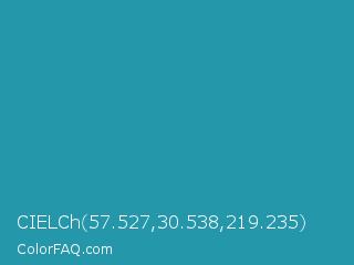 CIELCh 57.527,30.538,219.235 Color is a normal cyan color and the nearest color is Eastern Blue #1e9ab0. Hex code #2597ab and RGB value is rgb(37,151,171). In RGB color space, this color is composed of 15% red, 59% green, 67% blue, In CMYK color space, this color is composed of 78% cyan, 12% magenta, 0% yellow , 33% black , In HSL color space, this color has a hue angle of 189° , 64% saturation and 41% lightness.