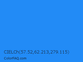 CIELCh 57.52,62.213,279.115 Color is a normal blue color and the nearest color is Dodger Blue #1e90ff. Hex code #228bf6 and RGB value is rgb(34,139,246). In RGB color space, this color is composed of 13% red, 55% green, 96% blue, In CMYK color space, this color is composed of 86% cyan, 43% magenta, 0% yellow , 4% black , In HSL color space, this color has a hue angle of 210° , 92% saturation and 55% lightness.