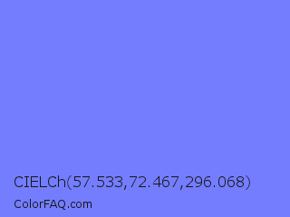 CIELCh 57.533,72.467,296.068 Color is a light blue color and the nearest color is Medium Slate Blue #7b68ee. Hex code #747dfd and RGB value is rgb(116,125,253). In RGB color space, this color is composed of 45% red, 49% green, 99% blue, In CMYK color space, this color is composed of 54% cyan, 51% magenta, 0% yellow , 1% black , In HSL color space, this color has a hue angle of 236° , 97% saturation and 72% lightness.