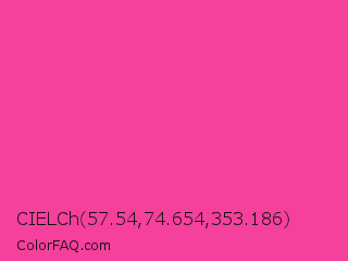 CIELCh 57.54,74.654,353.186 Color is a light rose color and the nearest color is Rose Bonbon #f9429e. Hex code #f5409c and RGB value is rgb(245,64,156). In RGB color space, this color is composed of 96% red, 25% green, 61% blue, In CMYK color space, this color is composed of 0% cyan, 74% magenta, 36% yellow , 4% black , In HSL color space, this color has a hue angle of 330° , 90% saturation and 61% lightness.