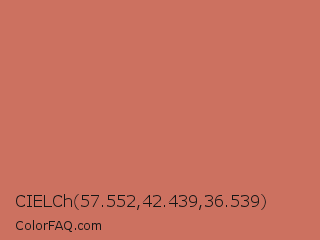 CIELCh 57.552,42.439,36.539 Color is a normal red color and the nearest color is Fuzzy Wuzzy #cc6666. Hex code #cc7160 and RGB value is rgb(204,113,96). In RGB color space, this color is composed of 80% red, 44% green, 38% blue, In CMYK color space, this color is composed of 0% cyan, 45% magenta, 53% yellow , 20% black , In HSL color space, this color has a hue angle of 9° , 51% saturation and 59% lightness.