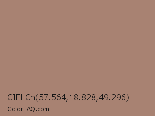 CIELCh 57.564,18.828,49.296 Color is a normal orange color and the nearest color is Beaver #9f8170. Hex code #a88272 and RGB value is rgb(168,130,114). In RGB color space, this color is composed of 66% red, 51% green, 45% blue, In CMYK color space, this color is composed of 0% cyan, 23% magenta, 32% yellow , 34% black , In HSL color space, this color has a hue angle of 18° , 24% saturation and 55% lightness.