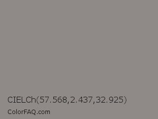 CIELCh 57.568,2.437,32.925 Color is a normal red color and the nearest color is Taupe Gray #8b8589. Hex code #8f8988 and RGB value is rgb(143,137,136). In RGB color space, this color is composed of 56% red, 54% green, 53% blue, In CMYK color space, this color is composed of 0% cyan, 4% magenta, 5% yellow , 44% black , In HSL color space, this color has a hue angle of 9° , 3% saturation and 55% lightness.