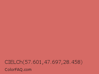 CIELCh 57.601,47.697,28.458 Color is a light red color and the nearest color is Fuzzy Wuzzy #cc6666. Hex code #d66a65 and RGB value is rgb(214,106,101). In RGB color space, this color is composed of 84% red, 42% green, 40% blue, In CMYK color space, this color is composed of 0% cyan, 50% magenta, 53% yellow , 16% black , In HSL color space, this color has a hue angle of 3° , 58% saturation and 62% lightness.