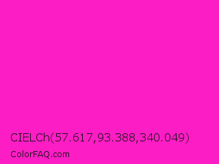 CIELCh 57.617,93.388,340.049 Color is a normal magenta color and the nearest color is Hot Magenta #ff1dce. Hex code #fc1dc4 and RGB value is rgb(252,29,196). In RGB color space, this color is composed of 99% red, 11% green, 77% blue, In CMYK color space, this color is composed of 0% cyan, 88% magenta, 22% yellow , 1% black , In HSL color space, this color has a hue angle of 315° , 97% saturation and 55% lightness.