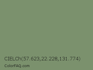 CIELCh 57.623,22.228,131.774 Color is a normal green color and the nearest color is Battleship Gray #828f72. Hex code #7b916d and RGB value is rgb(123,145,109). In RGB color space, this color is composed of 48% red, 57% green, 43% blue, In CMYK color space, this color is composed of 15% cyan, 0% magenta, 25% yellow , 43% black , In HSL color space, this color has a hue angle of 97° , 14% saturation and 50% lightness.