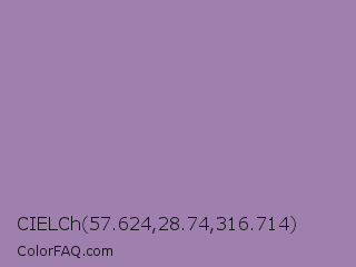 CIELCh 57.624,28.74,316.714 Color is a normal purple color and the nearest color is Lavender Purple #967bb6. Hex code #9f7fad and RGB value is rgb(159,127,173). In RGB color space, this color is composed of 62% red, 50% green, 68% blue, In CMYK color space, this color is composed of 8% cyan, 27% magenta, 0% yellow , 32% black , In HSL color space, this color has a hue angle of 282° , 22% saturation and 59% lightness.