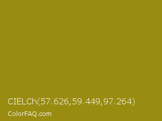 CIELCh 57.626,59.449,97.264 Color is a normal yellow color and the nearest color is Dark Yellow #9b870c. Hex code #998c11 and RGB value is rgb(153,140,17). In RGB color space, this color is composed of 60% red, 55% green, 7% blue, In CMYK color space, this color is composed of 0% cyan, 8% magenta, 89% yellow , 40% black , In HSL color space, this color has a hue angle of 54° , 80% saturation and 33% lightness.