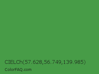 CIELCh 57.628,56.749,139.985 Color is a normal green color and the nearest color is May Green #4c9141. Hex code #479c47 and RGB value is rgb(71,156,71). In RGB color space, this color is composed of 28% red, 61% green, 28% blue, In CMYK color space, this color is composed of 54% cyan, 0% magenta, 54% yellow , 39% black , In HSL color space, this color has a hue angle of 120° , 37% saturation and 45% lightness.