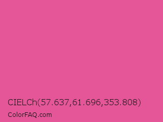CIELCh 57.637,61.696,353.808 Color is a light rose color and the nearest color is Raspberry Pink #e25098. Hex code #e55698 and RGB value is rgb(229,86,152). In RGB color space, this color is composed of 90% red, 34% green, 60% blue, In CMYK color space, this color is composed of 0% cyan, 62% magenta, 34% yellow , 10% black , In HSL color space, this color has a hue angle of 332° , 73% saturation and 62% lightness.