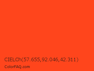 CIELCh 57.655,92.046,42.311 Color is a normal red color and the nearest color is Orioles Orange #fb4f14. Hex code #ff451c and RGB value is rgb(255,69,28). In RGB color space, this color is composed of 100% red, 27% green, 11% blue, In CMYK color space, this color is composed of 0% cyan, 73% magenta, 89% yellow , 0% black , In HSL color space, this color has a hue angle of 11° , 100% saturation and 55% lightness.