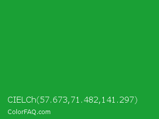 CIELCh 57.673,71.482,141.297 Color is a normal green color and the nearest color is North Texas Green #059033. Hex code #1aa035 and RGB value is rgb(26,160,53). In RGB color space, this color is composed of 10% red, 63% green, 21% blue, In CMYK color space, this color is composed of 84% cyan, 0% magenta, 67% yellow , 37% black , In HSL color space, this color has a hue angle of 132° , 72% saturation and 36% lightness.