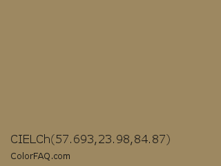 CIELCh 57.693,23.98,84.87 Color is a normal orange color and the nearest color is Barley Corn #a68b5b. Hex code #9d8861 and RGB value is rgb(157,136,97). In RGB color space, this color is composed of 62% red, 53% green, 38% blue, In CMYK color space, this color is composed of 0% cyan, 13% magenta, 38% yellow , 38% black , In HSL color space, this color has a hue angle of 39° , 24% saturation and 50% lightness.