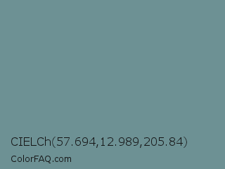 CIELCh 57.694,12.989,205.84 Color is a normal cyan color and the nearest color is Juniper #6d9292. Hex code #6d9194 and RGB value is rgb(109,145,148). In RGB color space, this color is composed of 43% red, 57% green, 58% blue, In CMYK color space, this color is composed of 26% cyan, 2% magenta, 0% yellow , 42% black , In HSL color space, this color has a hue angle of 185° , 15% saturation and 50% lightness.