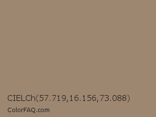 CIELCh 57.719,16.156,73.088 Color is a normal orange color and the nearest color is Beaver #9f8170. Hex code #9d8770 and RGB value is rgb(157,135,112). In RGB color space, this color is composed of 62% red, 53% green, 44% blue, In CMYK color space, this color is composed of 0% cyan, 14% magenta, 29% yellow , 38% black , In HSL color space, this color has a hue angle of 31° , 19% saturation and 53% lightness.