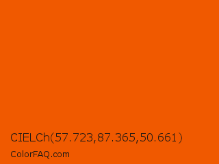 CIELCh 57.723,87.365,50.661 Color is a normal orange color and the nearest color is Persimmon #ec5800. Hex code #f05900 and RGB value is rgb(240,89,0). In RGB color space, this color is composed of 94% red, 35% green, 0% blue, In CMYK color space, this color is composed of 0% cyan, 63% magenta, 100% yellow , 6% black , In HSL color space, this color has a hue angle of 22° , 100% saturation and 47% lightness.