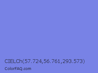 CIELCh 57.724,56.761,293.573 Color is a light blue color and the nearest color is Chetwode Blue #8581d9. Hex code #7882e6 and RGB value is rgb(120,130,230). In RGB color space, this color is composed of 47% red, 51% green, 90% blue, In CMYK color space, this color is composed of 48% cyan, 43% magenta, 0% yellow , 10% black , In HSL color space, this color has a hue angle of 235° , 69% saturation and 69% lightness.