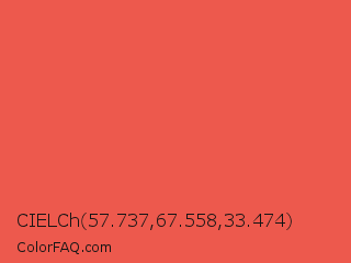 CIELCh 57.737,67.558,33.474 Color is a light red color and the nearest color is Carmine Pink #eb4c42. Hex code #ed594d and RGB value is rgb(237,89,77). In RGB color space, this color is composed of 93% red, 35% green, 30% blue, In CMYK color space, this color is composed of 0% cyan, 62% magenta, 68% yellow , 7% black , In HSL color space, this color has a hue angle of 5° , 82% saturation and 62% lightness.