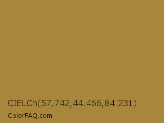 CIELCh 57.742,44.466,84.231 Color is a normal orange color and the nearest color is Luxor Gold #a7882c. Hex code #a8863b and RGB value is rgb(168,134,59). In RGB color space, this color is composed of 66% red, 53% green, 23% blue, In CMYK color space, this color is composed of 0% cyan, 20% magenta, 65% yellow , 34% black , In HSL color space, this color has a hue angle of 41° , 48% saturation and 45% lightness.
