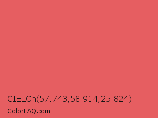 CIELCh 57.743,58.914,25.824 Color is a light red color and the nearest color is Roman #de6360. Hex code #e65e61 and RGB value is rgb(230,94,97). In RGB color space, this color is composed of 90% red, 37% green, 38% blue, In CMYK color space, this color is composed of 0% cyan, 59% magenta, 58% yellow , 10% black , In HSL color space, this color has a hue angle of 359° , 73% saturation and 64% lightness.