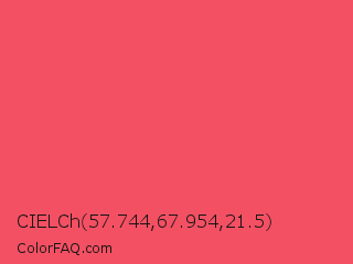 CIELCh 57.744,67.954,21.5 Color is a light red color and the nearest color is Carnation #f95a61. Hex code #f35063 and RGB value is rgb(243,80,99). In RGB color space, this color is composed of 95% red, 31% green, 39% blue, In CMYK color space, this color is composed of 0% cyan, 67% magenta, 59% yellow , 5% black , In HSL color space, this color has a hue angle of 353° , 87% saturation and 63% lightness.