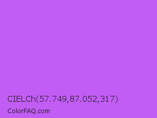 CIELCh 57.749,87.052,317 Color is a light purple color and the nearest color is Medium Orchid #ba55d3. Hex code #c15df4 and RGB value is rgb(193,93,244). In RGB color space, this color is composed of 76% red, 36% green, 96% blue, In CMYK color space, this color is composed of 21% cyan, 62% magenta, 0% yellow , 4% black , In HSL color space, this color has a hue angle of 280° , 87% saturation and 66% lightness.