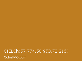 CIELCh 57.774,58.953,72.215 Color is a normal orange color and the nearest color is University Of California Gold #b78727. Hex code #be7d21 and RGB value is rgb(190,125,33). In RGB color space, this color is composed of 75% red, 49% green, 13% blue, In CMYK color space, this color is composed of 0% cyan, 34% magenta, 83% yellow , 25% black , In HSL color space, this color has a hue angle of 35° , 70% saturation and 44% lightness.