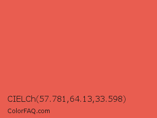 CIELCh 57.781,64.13,33.598 Color is a light red color and the nearest color is Jelly Bean #da614e. Hex code #e95d50 and RGB value is rgb(233,93,80). In RGB color space, this color is composed of 91% red, 36% green, 31% blue, In CMYK color space, this color is composed of 0% cyan, 60% magenta, 66% yellow , 9% black , In HSL color space, this color has a hue angle of 5° , 78% saturation and 61% lightness.