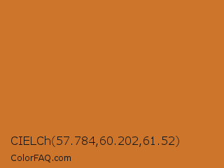 CIELCh 57.784,60.202,61.52 Color is a normal orange color and the nearest color is Ochre #cc7722. Hex code #cc752b and RGB value is rgb(204,117,43). In RGB color space, this color is composed of 80% red, 46% green, 17% blue, In CMYK color space, this color is composed of 0% cyan, 43% magenta, 79% yellow , 20% black , In HSL color space, this color has a hue angle of 28° , 65% saturation and 48% lightness.