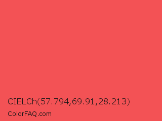 CIELCh 57.794,69.91,28.213 Color is a light red color and the nearest color is Carnation #f95a61. Hex code #f35255 and RGB value is rgb(243,82,85). In RGB color space, this color is composed of 95% red, 32% green, 33% blue, In CMYK color space, this color is composed of 0% cyan, 66% magenta, 65% yellow , 5% black , In HSL color space, this color has a hue angle of 359° , 87% saturation and 64% lightness.
