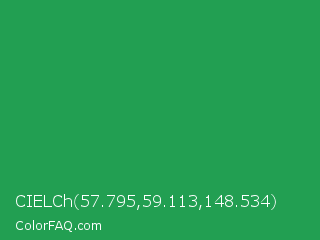 CIELCh 57.795,59.113,148.534 Color is a normal green color and the nearest color is Eucalyptus #278a5b. Hex code #229f52 and RGB value is rgb(34,159,82). In RGB color space, this color is composed of 13% red, 62% green, 32% blue, In CMYK color space, this color is composed of 79% cyan, 0% magenta, 48% yellow , 38% black , In HSL color space, this color has a hue angle of 143° , 65% saturation and 38% lightness.