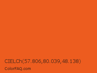 CIELCh 57.806,80.039,48.138 Color is a normal orange color and the nearest color is Vivid Vermilion #e56024. Hex code #ed5c1f and RGB value is rgb(237,92,31). In RGB color space, this color is composed of 93% red, 36% green, 12% blue, In CMYK color space, this color is composed of 0% cyan, 61% magenta, 87% yellow , 7% black , In HSL color space, this color has a hue angle of 18° , 85% saturation and 53% lightness.