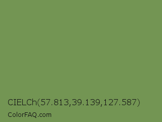 CIELCh 57.813,39.139,127.587 Color is a normal green color and the nearest color is Asparagus Green #7ba05b. Hex code #739553 and RGB value is rgb(115,149,83). In RGB color space, this color is composed of 45% red, 58% green, 33% blue, In CMYK color space, this color is composed of 23% cyan, 0% magenta, 44% yellow , 42% black , In HSL color space, this color has a hue angle of 91° , 28% saturation and 45% lightness.
