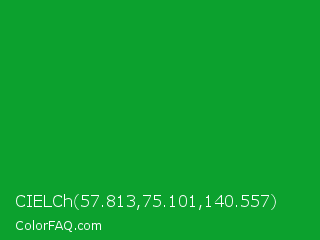 CIELCh 57.813,75.101,140.557 Color is a normal green color and the nearest color is North Texas Green #059033. Hex code #0ca12e and RGB value is rgb(12,161,46). In RGB color space, this color is composed of 5% red, 63% green, 18% blue, In CMYK color space, this color is composed of 93% cyan, 0% magenta, 71% yellow , 37% black , In HSL color space, this color has a hue angle of 134° , 86% saturation and 34% lightness.