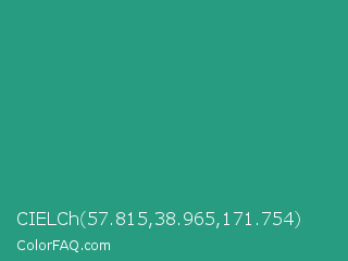 CIELCh 57.815,38.965,171.754 Color is a normal cyan color and the nearest color is Jungle Green #29ab87. Hex code #279c80 and RGB value is rgb(39,156,128). In RGB color space, this color is composed of 15% red, 61% green, 50% blue, In CMYK color space, this color is composed of 75% cyan, 0% magenta, 18% yellow , 39% black , In HSL color space, this color has a hue angle of 166° , 60% saturation and 38% lightness.