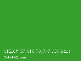 CIELCh 57.818,70.747,136.921 Color is a normal green color and the nearest color is Wageningen Green #34b233. Hex code #369f2d and RGB value is rgb(54,159,45). In RGB color space, this color is composed of 21% red, 62% green, 18% blue, In CMYK color space, this color is composed of 66% cyan, 0% magenta, 72% yellow , 38% black , In HSL color space, this color has a hue angle of 115° , 56% saturation and 40% lightness.