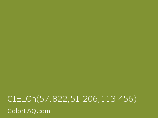 CIELCh 57.822,51.206,113.456 Color is a normal lime color and the nearest color is Sycamore #908d39. Hex code #819333 and RGB value is rgb(129,147,51). In RGB color space, this color is composed of 51% red, 58% green, 20% blue, In CMYK color space, this color is composed of 12% cyan, 0% magenta, 65% yellow , 42% black , In HSL color space, this color has a hue angle of 71° , 48% saturation and 39% lightness.