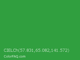 CIELCh 57.831,65.082,141.572 Color is a normal green color and the nearest color is Wageningen Green #34b233. Hex code #309f3f and RGB value is rgb(48,159,63). In RGB color space, this color is composed of 19% red, 62% green, 25% blue, In CMYK color space, this color is composed of 70% cyan, 0% magenta, 60% yellow , 38% black , In HSL color space, this color has a hue angle of 128° , 54% saturation and 41% lightness.