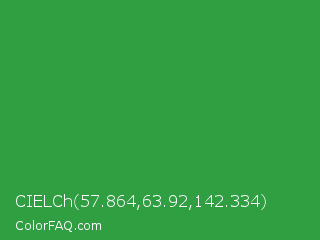 CIELCh 57.864,63.92,142.334 Color is a normal green color and the nearest color is Wageningen Green #34b233. Hex code #309f42 and RGB value is rgb(48,159,66). In RGB color space, this color is composed of 19% red, 62% green, 26% blue, In CMYK color space, this color is composed of 70% cyan, 0% magenta, 58% yellow , 38% black , In HSL color space, this color has a hue angle of 130° , 54% saturation and 41% lightness.