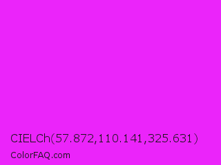 CIELCh 57.872,110.141,325.631 Color is a normal magenta color and the nearest color is Phlox #df00ff. Hex code #eb24fa and RGB value is rgb(235,36,250). In RGB color space, this color is composed of 92% red, 14% green, 98% blue, In CMYK color space, this color is composed of 6% cyan, 86% magenta, 0% yellow , 2% black , In HSL color space, this color has a hue angle of 296° , 96% saturation and 56% lightness.